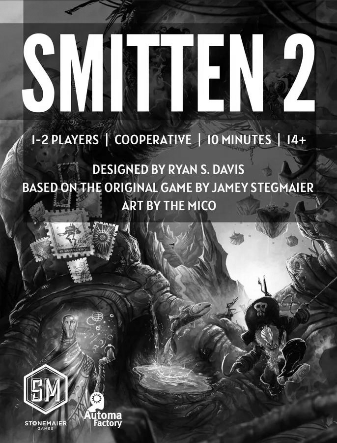 Smitten's core design was inspired by comic book cards from Jamey’s youth, specifically a set where various cards formed a cohesive 9-card panorama image. In trying to complete two of these images in Smitten, there is no set turn order; rather, players indicate a preference to play or not play a card. The played card has instructions for the other player to place a card, which they must do or the game instantly ends.
