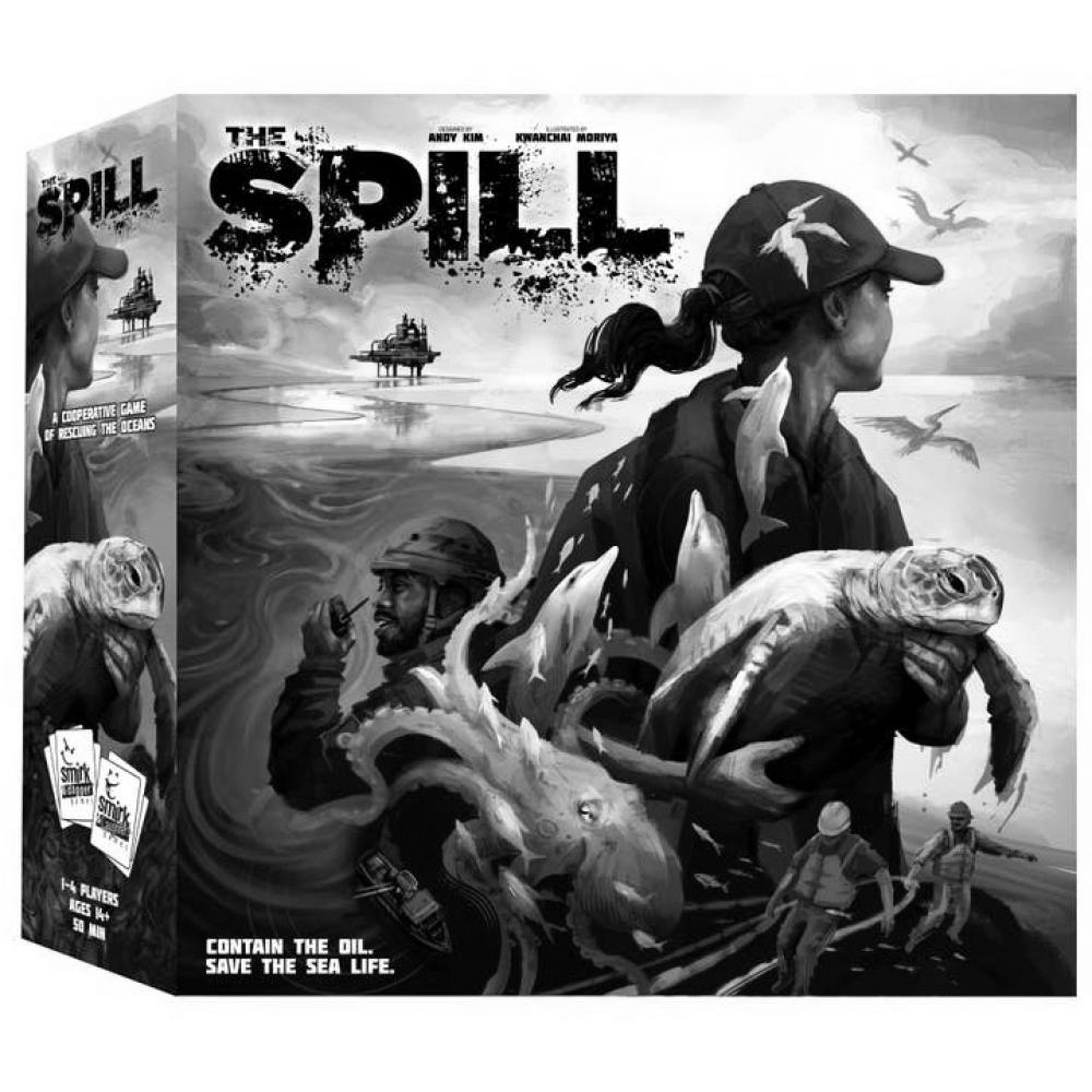 A cooperative game you win or lose together as a team, for 1-4 players. Features a 4-way dice tower as the oil rig, which randomly drops oil dice onto the four quadrants of the game board. In this respect, the game is a reverse tower defense game, as players sail the perimeter trying to push back and contain the oil, remove dice from the water and save the sea life.