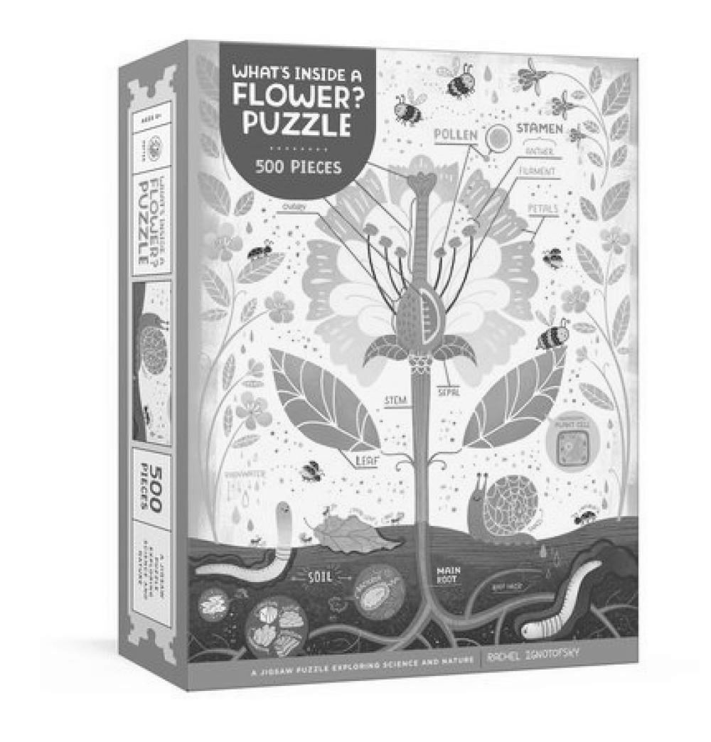 The uniquely informative and charming art from Rachel Ignotofsky's book What’s Inside a Flower? reveals the magic of plants in this family-friendly 500-piece puzzle. As you piece the puzzle together, explore the beautiful details inside a flower from the petals and stamen to the minerals in the soil that the flower needs to flourish. The full puzzle design is featured on the back of the box for reference. Perfect for science lovers, students, gardeners, and more, What’s Inside a Flower? Puzzle brings the hidden intricacies of flowers to vibrant life.