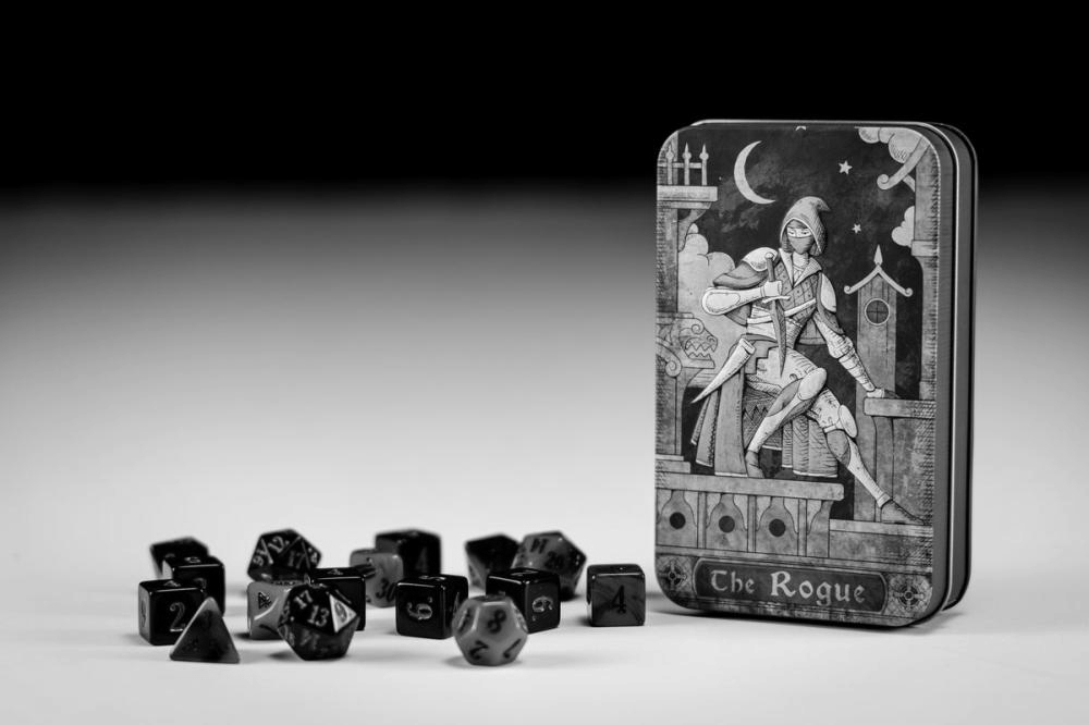 Pick the lock on this tin to reveal 16 dice in two color design, with tons of d6s for the stabbing, as well as extra d20s for scurrying about in the shadows and the advantage rolls that it brings.