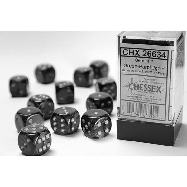 Chessex 16mm 12d6 Dice Block: Gemini (Black Light Reactive) - Green-Purple/Gold