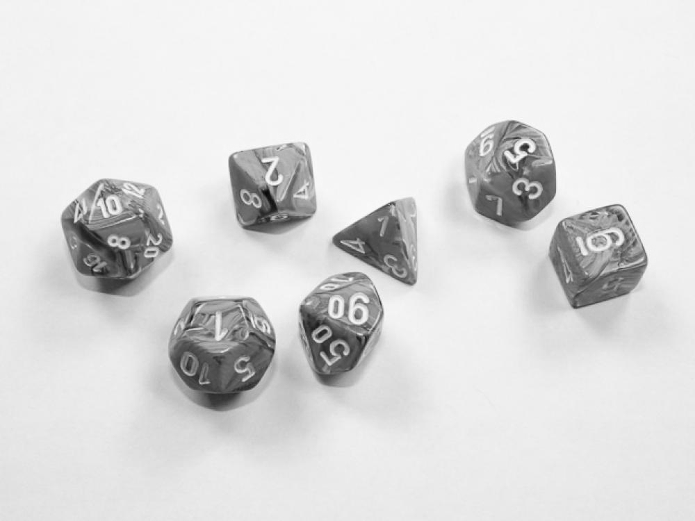 Contains 7 Marble Oxi Copper Dice with white numbers in the following Shapes: