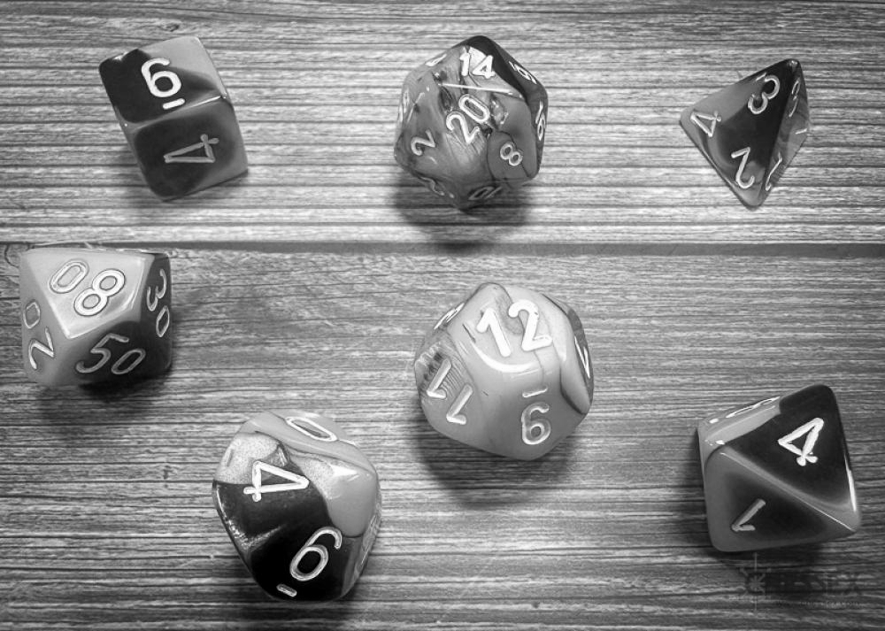 This set contains 7 Gemini Black-Pink dice with white numbers with the following shapes: