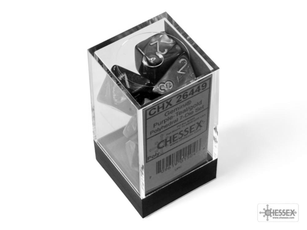 This set contains 7 Gemini Purple-Teal dice with gold numbers with the following shapes: