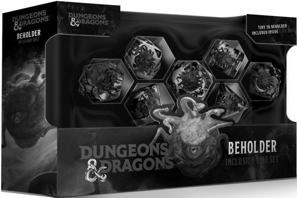 Bring the power of the beholder with you on your next adventure and roll with confidence! This finely crafted seven-piece ''Inclusion'' dice set features a tiny 3D beholder inside each die. Will the gaze of the beholder lead your party to epic success...or epic failure? The roll of the dice will decide!
