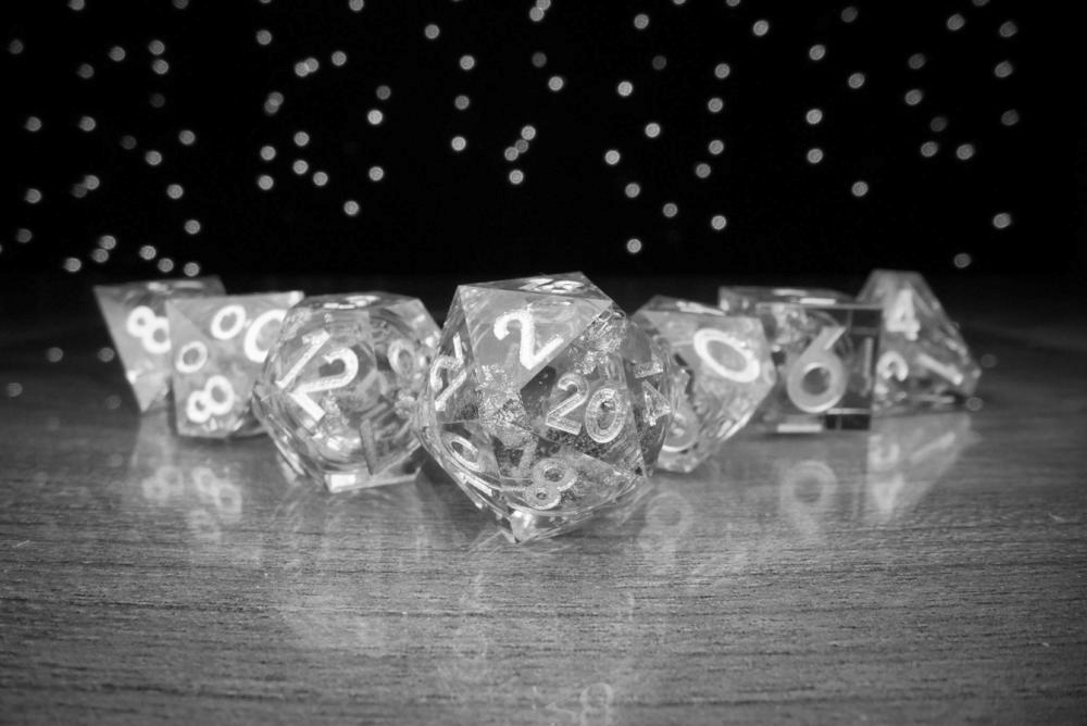 From our innovative Kickstarter, Elixir dice are infused with glittery liquid cores that swirl when rolled. Each set is handcrafted and polished to keep their beautiful sharp edges. When the liquid cores are molded into the dice, the heat from molding creates a small bubble in the liquid core. Since the bubble in the liquid is constantly moving, we have not seen an effect on rolling. These full-sized polyhedral dice sets come with 7 dice (d4, d6, d8, d10, d10%(00-90), d12, and d20).