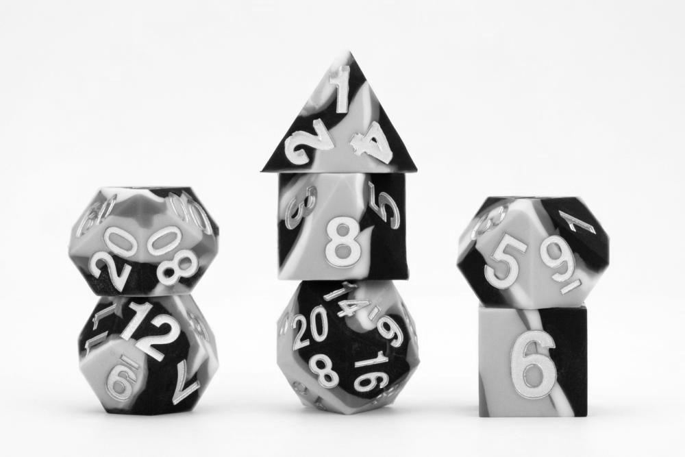 Sharp edges provide a precise roll that is complemented with the slight bounce of silicone. Each full-sized, 16mm set comes with 7 dice (d4, d6, d8, d10, d10% (00-90), d12, and d20).