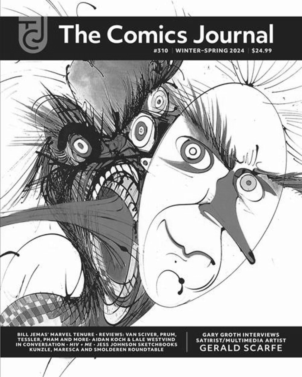 Multimedia artist and satirist Gerald Scarfe, best known globally for his Pink Floyd's The Wall and Disney's Hercules iconography, talks to Gary Groth about his scabrous film, TV, and comics career, spanning 60+ years. Also: in-depth journalism covering Bill Jemas' vice presidency and the creation of the Marvel Ultimates Universe during the wild last days of pre-movie monolith Marvel, when Ike Perlmutter roamed the halls; art-comics creators Aidan Koch and Lale Westvind in conversation; plus, original comics, archival material, and more.