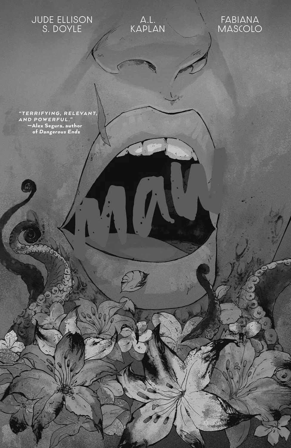 Dragged by her sister Wendy to a feminist retreat on a remote island of Antgitia, Marion Angela Weber is seeking perspective and empowerment, but a disastrous first night leaves her frightfully changed. In the aftermath of an assault, Marion begins to transform as an unspeakable hunger crawls through her body. When the townsfolk recognize there's something different about Marion, they react with suspicion, then violence, while ignoring the monsters already among them. Critically acclaimed journalist/opinion writer Jude Ellison S. Doyle (Dead Blondes and Bad Mothers) with artist A.L. Kaplan (Full Spectrum Therapy, Heart of Gold), and colorist Fabian Mascolo (Firefly: Brand New ‘Verse) unleash Maw, a status-quo-shattering tale examining the consequences of sexist violence and the subjugation of marginalized genders, and what happens when the wounded are backed into a corner.
