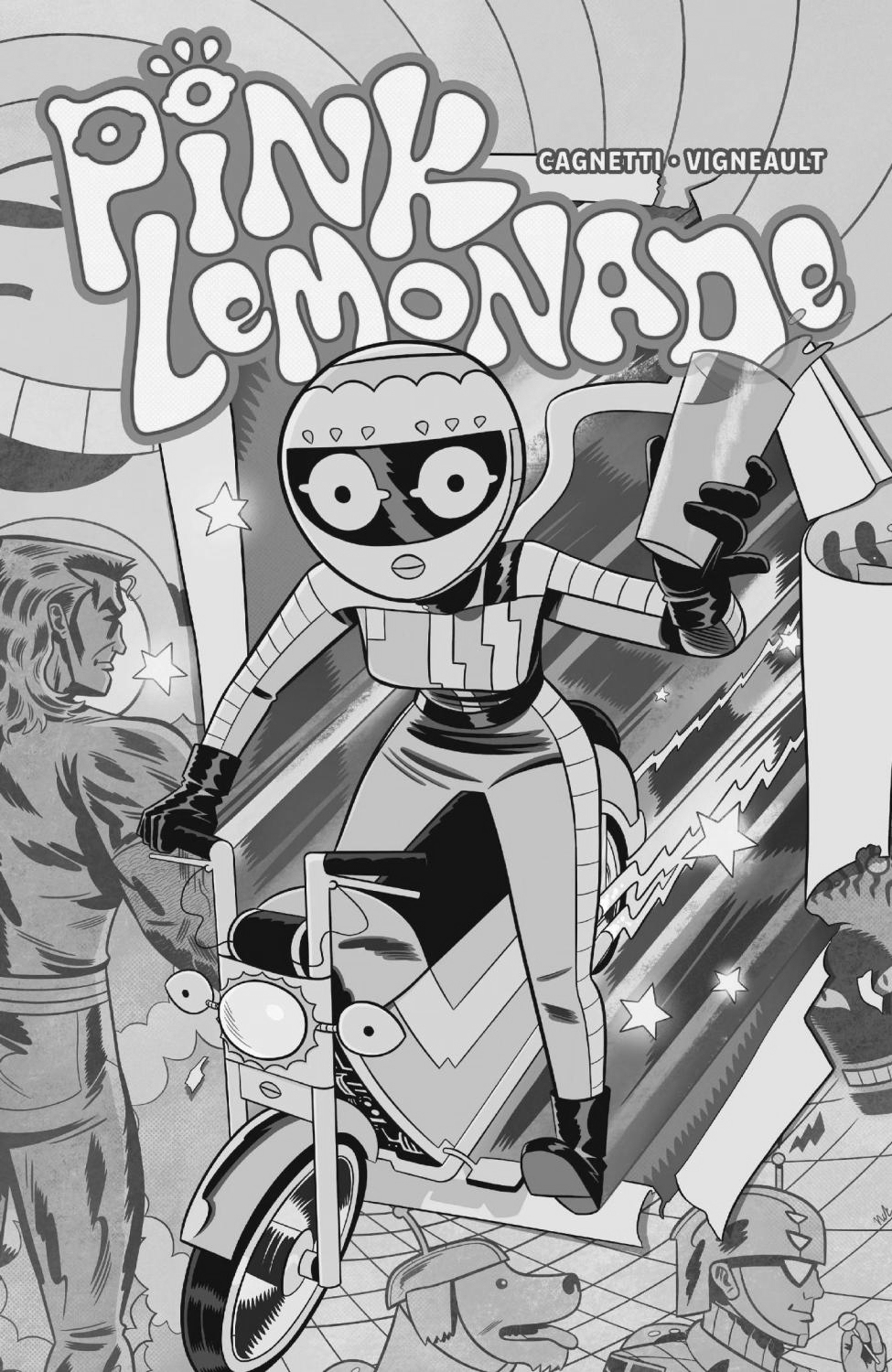 Mysterious past! Colorful costume! Altruistic outlook! Zippy motorcycle! And one very overactive imagination! Meet PINK LEMONADE—the new hero on the scene! She dreams of doing big things, but ultimately, she'll settle for just helping where she can. But when Pink Lemonade accidentally crashes into the set of the next Rex Radical blockbuster, she'll take an unexpected leap into the spotlight...and will soon find herself confronted by a series of increasingly threatening doppelgängers, extraterrestrial fanboys, and nefarious corporate machinations.