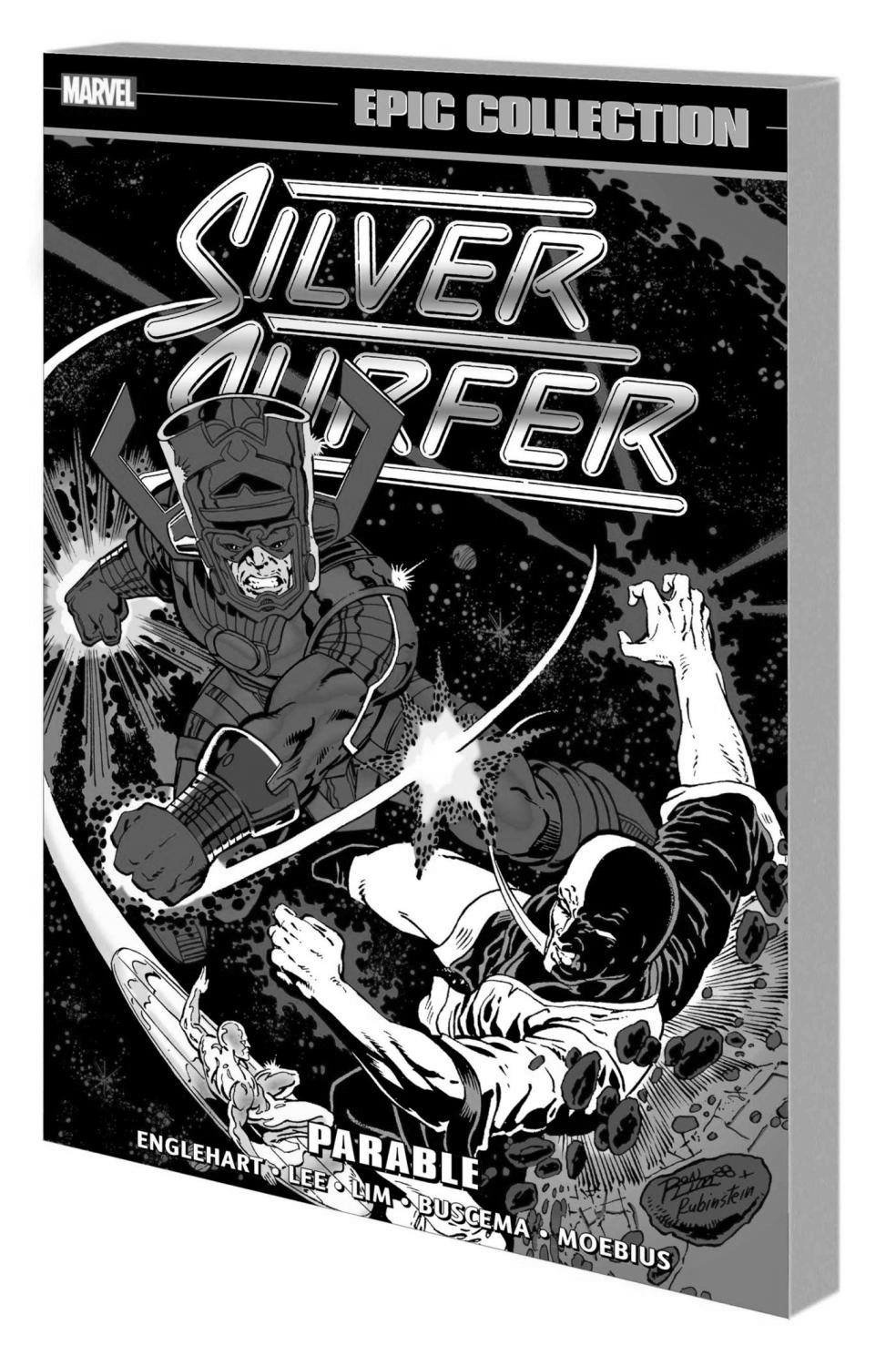 Timeless tales of the Silver Surfer! Galactus' latest meal, the powerful Elders of the Universe, isn't sitting well - and only the Surfer and Fantastic Four can cure his fatal case of cosmic indigestion! Meanwhile, Norrin's relationship with Nova hits the rocks thanks to Firelord, Ego the Living Planet seeks to consume the Surfer and a Kree/Skrull conflict builds to a boil! And finally, the incomparable Stan Lee returns to script two standout sagas: Mephisto bedevils the Surfer in a graphic novel drawn by the legendary John Buscema! And visionary talent Moebius illustrates a thoughtful epic wherein the only one who can stop Galactus from leading mankind to its doom…is the Silver Surfer! Collecting SILVER SURFER (1987) #15-23 and ANNUAL #1-2, FANTASTIC FOUR (1961) #325, MARVEL GRAPHIC NOVEL: SILVER SURFER, SILVER SURFER (1988) #1-2 and material from MARVEL COMICS PRESENTS (1988) #1. Rated T+ (W) Steve Englehart, More (A) Ron Lim, More (CA) Ron Lim