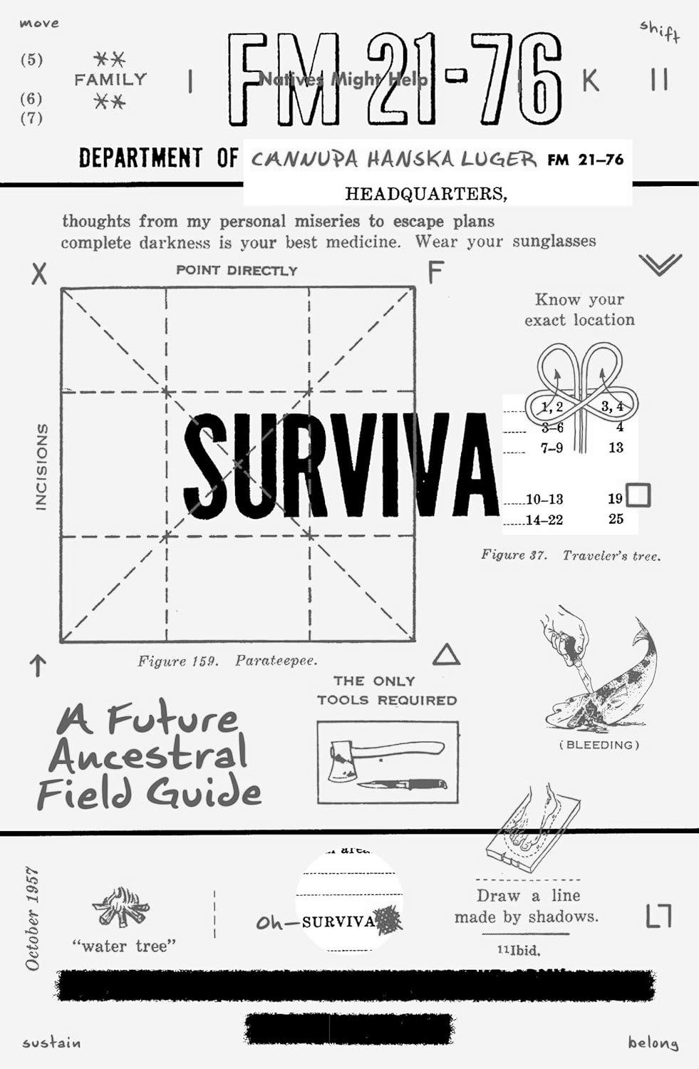 Part graphic novel, part art book, SURVIVA: A Future Ancestral Field Guide offers readers a view beneath, beyond, and between the lines of Luger's ever-expanding artistic universe. In this ecstatically hybrid work, Luger transforms a 1970s military survival guide through poetic redaction, speculative fiction, and iterative line drawing—deftly surfacing and disrupting the colonial subconscious that haunts this vexed source text. An epic and timely meditation on planetary life in the midst of transformation, SURVIVA boldly presents an earth-based, demilitarized futuredream that foregrounds Indigenous knowledge as critical to humanity’s survival.