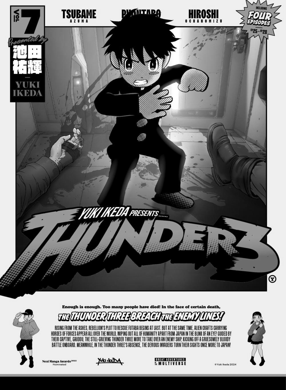 An amazing blend of art styles combined with hard-SF elements and meta-comedy to create a comic truly unlike any other!The THUNDER THREE BREACH the ENEMY LINES!Rising from the ashes, Rebellion's plot to rescue Futaba begins at last. But at the same time, alien crafts carrying hordes of forces appear all over the world, wiping out all of humanity apart from Japan in the blink of an eye! Guided by their captive, Gaudou, the still-grieving Thunder Three move to take over an enemy ship, kicking off a gruesomely bloody battle onboard. Meanwhile, in the Thunder Three's absence, the devious invaders turn their sights once more to Japan!