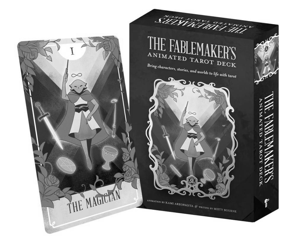 The Fablemaker's Animated Tarot Deck uses lenticular technology to bring a new energy to tarot, each card featuring an 8-frame looping animation that comes to life when the card is tilted! This tarot deck has been designed to be used in your 5e games, as well as for divination! This deck includes all Major and Minor Arcana (78 cards in total) along with a simple booklet to guide you through their meanings.
